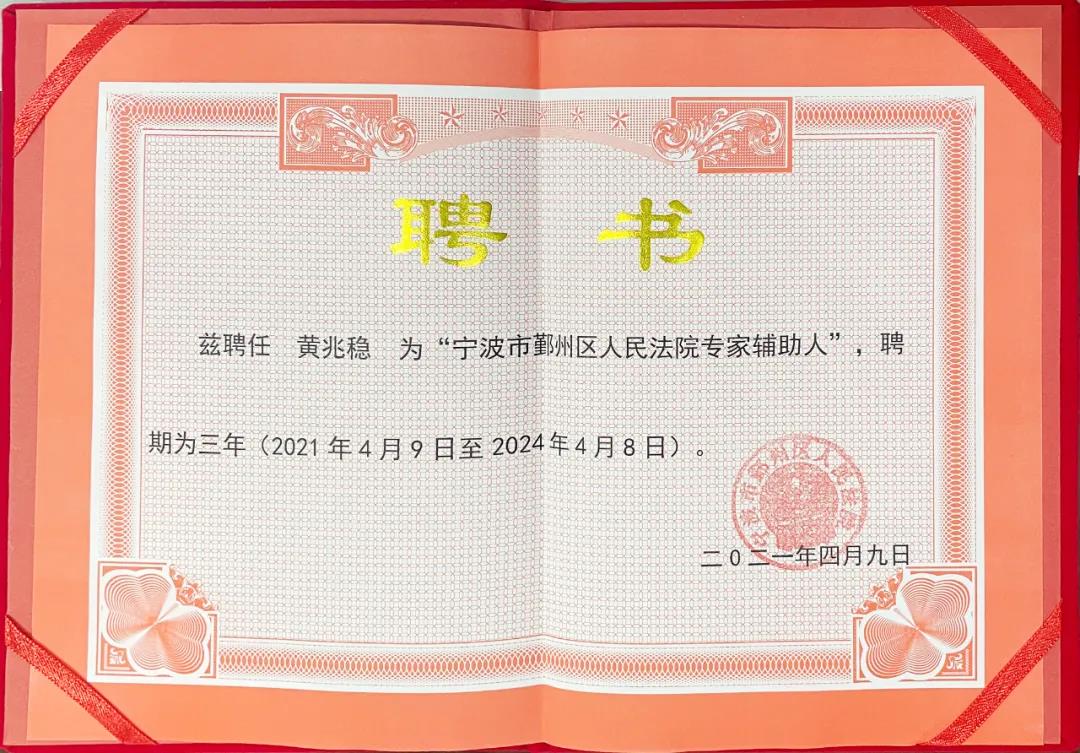 4 月 9 日,鄞州法院公布首批法院专家辅助人名单,共有 22 位医学、建筑、 审计、证券、保险、市场监管、测绘等领域中具有较高专业权威、良好专业操守的实务专家,我司管理合伙人黄兆稳是唯一入选的建设工程造价“外脑”。